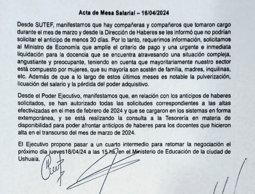 Este martes se retomó la Mesa Paritaria Salarial en las instalaciones del Ministerio de Educación en la ciudad de Ushuaia. Al inicio de la reunión, desde SUTEF reclamaron a las autoridades del Ejecutivo que la Dirección de Haberes niega los anticipos a docentes que tomaron cargos durante el mes de marzo. Se requirió información y se solicitó al Ministro de Economía que amplíe el criterio de pago y una urgente e inmediata liquidación “para la docencia que se encuentra atravesando una situación compleja, angustiante y preocupante”, expresaron.