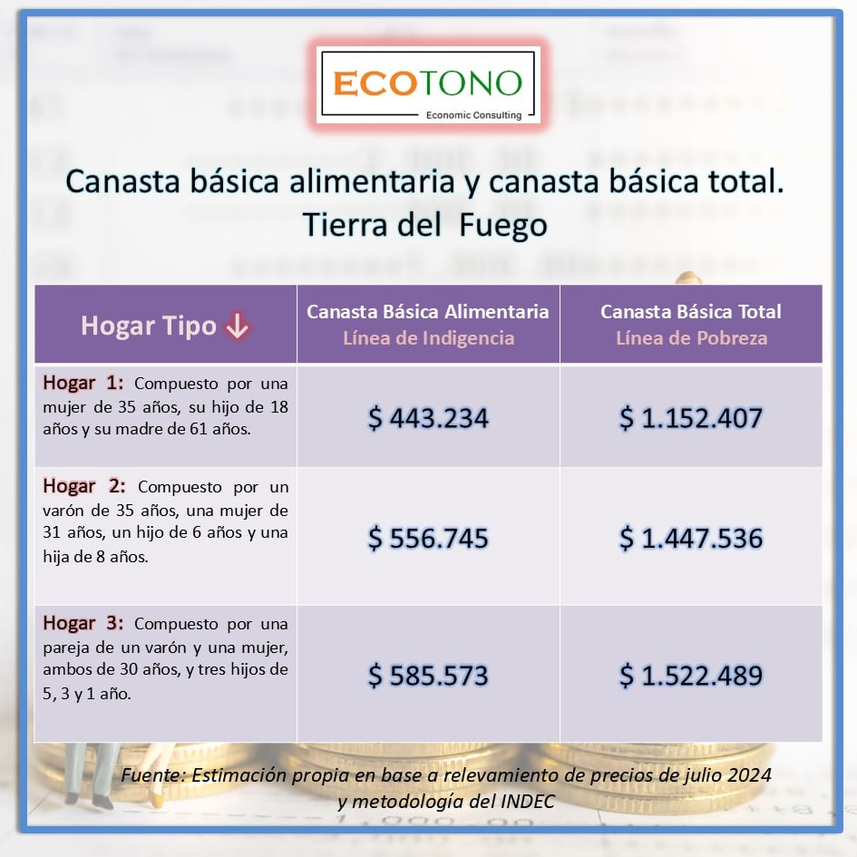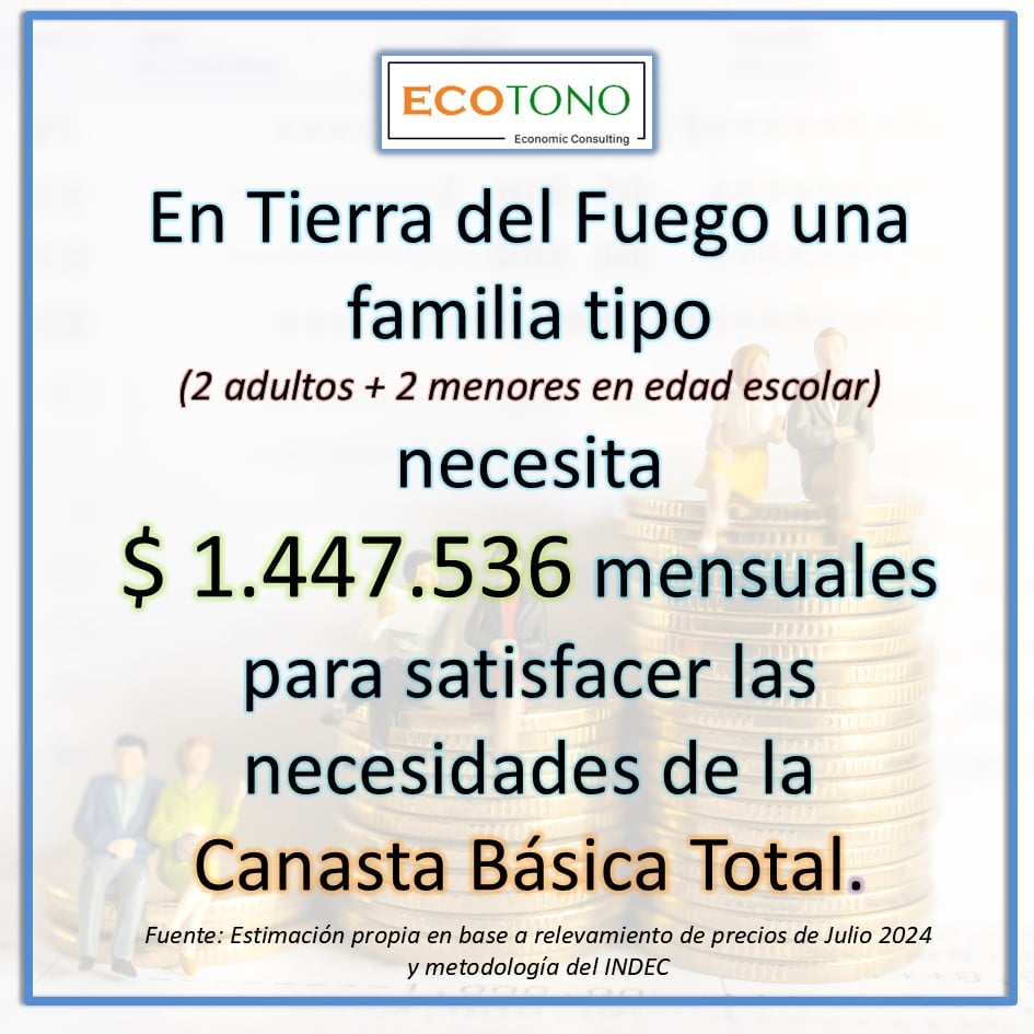 En este sentido, Ecotono estimó las correspondientes canastas de julio para Tierra del Fuego. Un adulto requiere $180.176 para no ser indigente y $468.458 para no ser pobre.