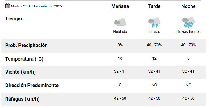 En este sentido, precisaron que “se esperan valores de precipitación acumulada entre 10 y 15 mm, pudiendo ser superados de forma puntual, sobre todo en zonas más elevadas”.