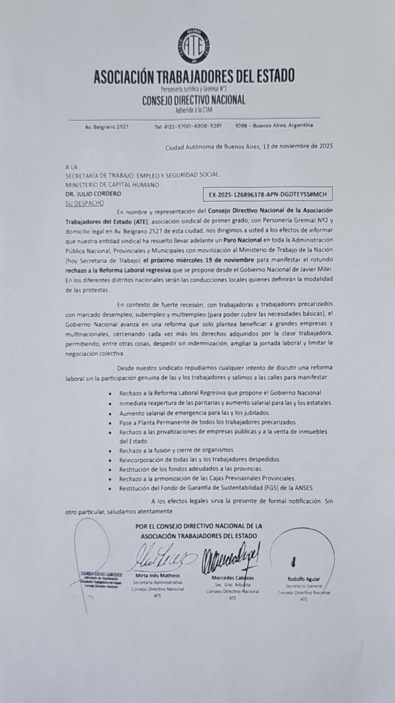 La medida tendrá alcance en el ámbito municipal y provincial e incluye una movilización que comenzará a las 10:00 AM en la sede del Ministerio de Trabajo ubicada en la calle 9 de julio.