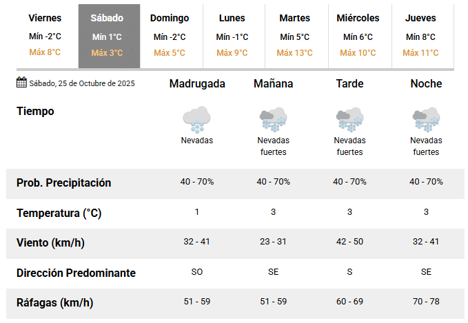 El sábado 25 de octubre será una jornada marcada por las nevadas fuertes y el viento: