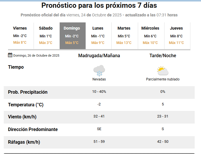• Mañana Polar: En el tramo madrugada/mañana, la temperatura caerá a -2°C, con nevadas y ráfagas que oscilarán entre 51 y 59 km/h.
