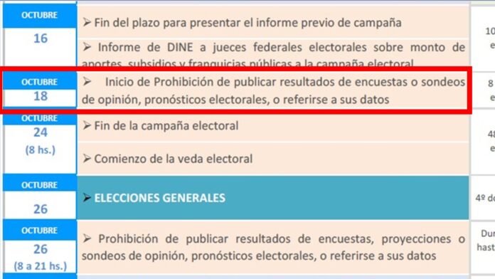 La denuncia surge luego de que “dirigentes de Fuerza Patria difundieran materiales gráficos con supuestos resultados de intención de voto y mensajes políticos que buscan influir en el electorado, pese a que la veda de encuestas comenzó el 18 de octubre, según el cronograma oficial de la Dirección Nacional Electoral (DINE)”, informaron desde el frente.