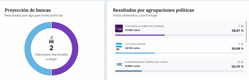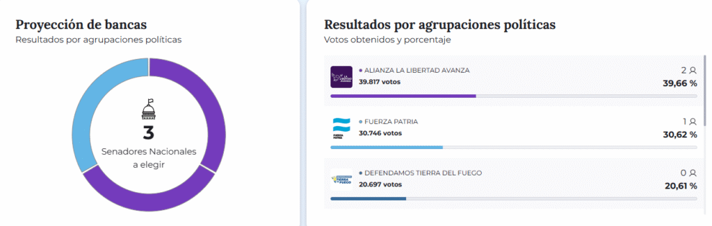 Con el 99,77% de las mesas escrutadas (452 de 453) la Libertad Avanza consiguió un categórico triunfo en toda la provincia de Tierra del Fuego y se quedó con dos bancas para el Senado y una para Diputados.