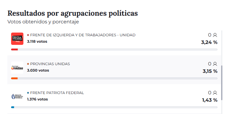 A diferencia de lo sucedido en senadores, el FRENTE DE IZQUIERDA Y DE TRABAJADORES – UNIDAD se quedó con el cuarto lugar con el 3,24% por encima de Provincias Unidas que obtuvo el 3,15%.
