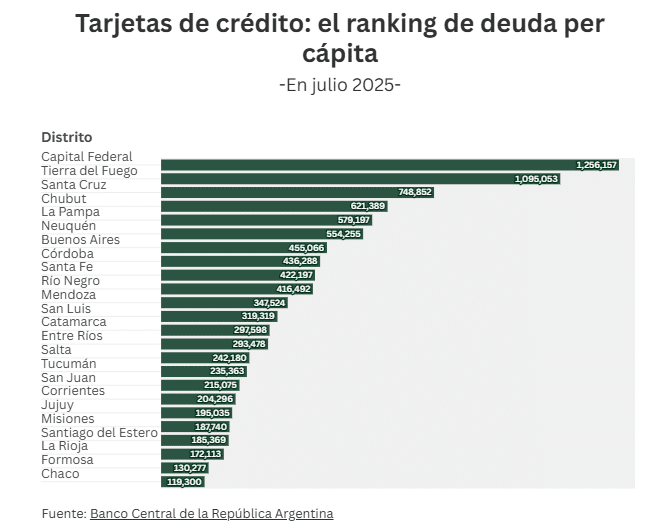 En el otro extremo del ranking de deudas con tarjetas de crédito por habitante, aparecen las provincias de La Rioja ($ 172.000 por persona), Formosa ($ 130.000) y Chaco ($ 119.000).
