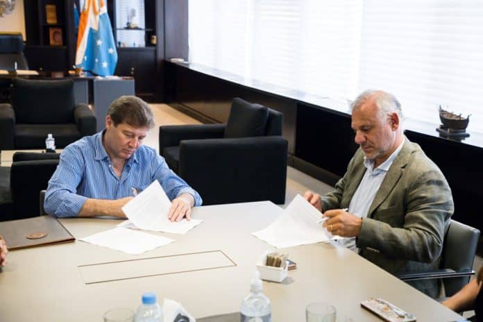El gobernador Gustavo Melella, junto a Luis Galli, presidente y CEO del Grupo Newsan, firmaron un acuerdo de cooperación mutua para dotar de más infraestructura al cultivo de mejillones en Almanza. El convenio contempla la construcción de un muelle modular flotante y de una base de operaciones, que favorece a la producción de mejillones.