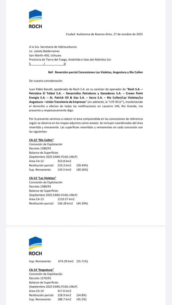 Este lunes, se dió a conocer que el apoderado de la empresa, Juan Pablo Baiutti, presentó, el pasado 27 de octubre, una nota a la secretaría de Hidrocarburos de la Provincia para informarles sobre la “reversión parcial de las Concesiones Las Violetas, Angostura y Río Cullen”.