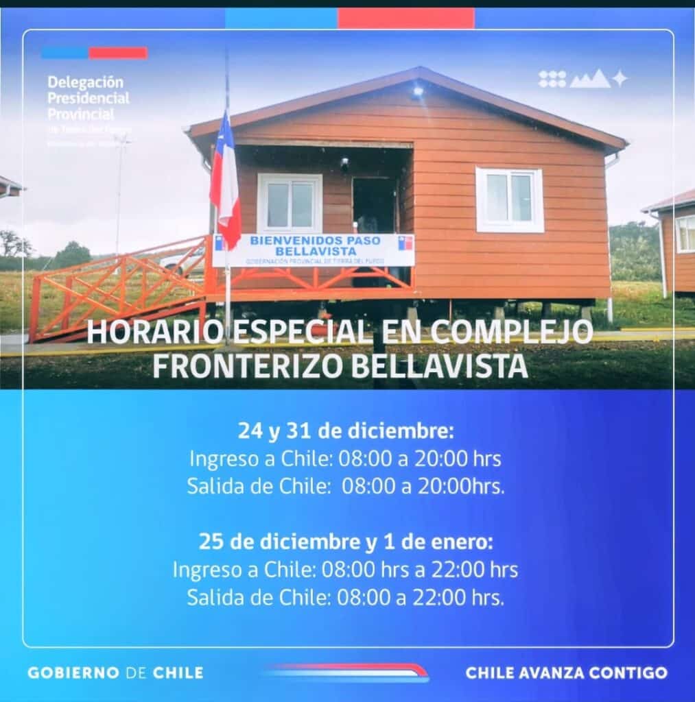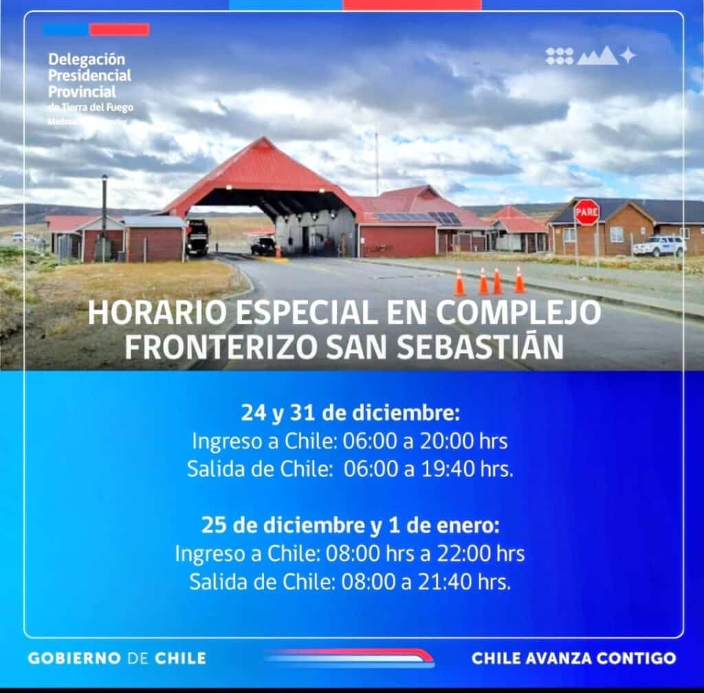 En el Complejo Fronterizo San Sebastián, los días 24 y 31 de diciembre el ingreso a Chile estará habilitado de 06:00 a 20:00 y la salida de 06:00 a 19:40 hrs; en tanto, el 25 de diciembre y 1 de enero el ingreso será de 08:00 a 22:00 y la salida de 08:00 a 21:40.