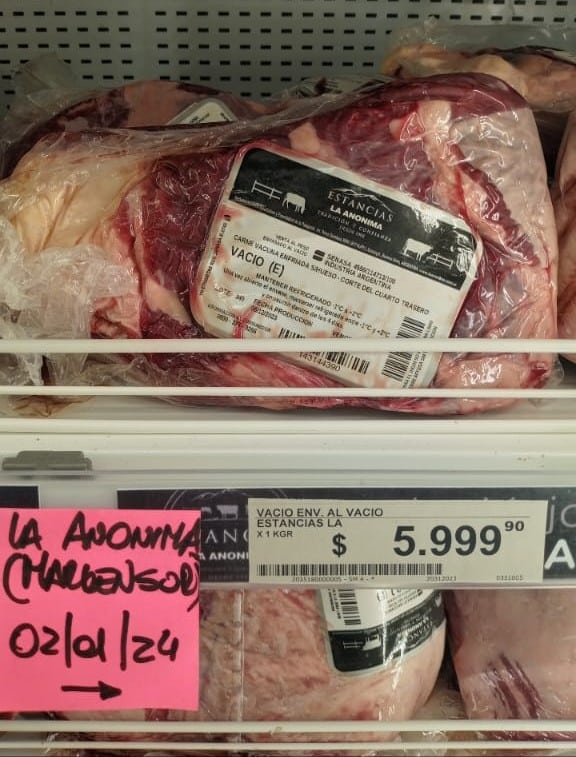 La línea de tiempo es implacable. En el supermercado de 25 de Mayo y Roldán, la historia se cuenta en dos etiquetas: El 2 de enero de 2024, un cartel rosa, escrito a mano con marcador, anunciaba el kilo de Vacío a $5.999,90. En ese entonces, con seis billetes de mil, el fuego ya estaba prendido.