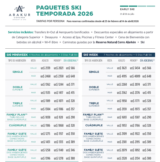 El paquete Miniweek (4 noches de alojamiento y 3 días de Full Ski) se posiciona como el producto estrella para los que buscan una escapada intensa. Aunque los precios pueden generar vértigo —casi tanto como asomarse a los ventanales del hotel—, la propuesta de Arakur sigue siendo el imán principal para el turismo internacional y el segmento ABC1 nacional que busca exclusividad absoluta.