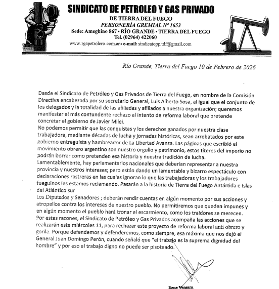 En un clima de creciente tensión social y política, el Sindicato de Petróleo y Gas Privados de Tierra del Fuego emitió un comunicado oficial en el que manifiesta su “más contundente rechazo” al proyecto de reforma laboral impulsado por la gestión de Javier Milei.