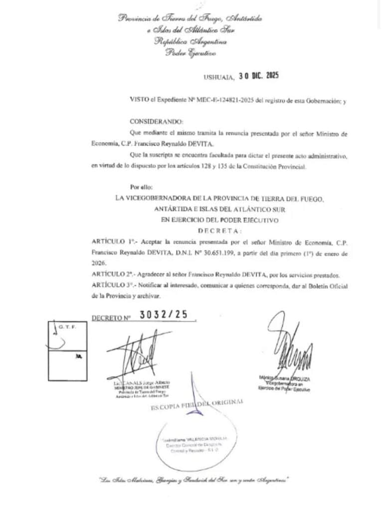 La salida de Devita no resulta un dato menor para el tablero político fueguino. El funcionario había desembarcado en la cartera económica en diciembre de 2023, trayendo consigo el prestigio de su paso por la Contaduría General de la Provincia.
